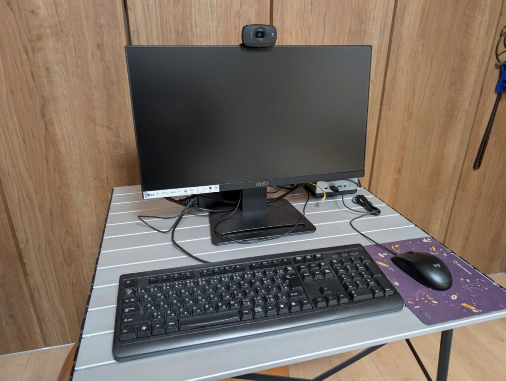 私は、寝室の一角に以下のような環境を準備しました。バーベキュー用のアルミ折り畳み机を使っています。