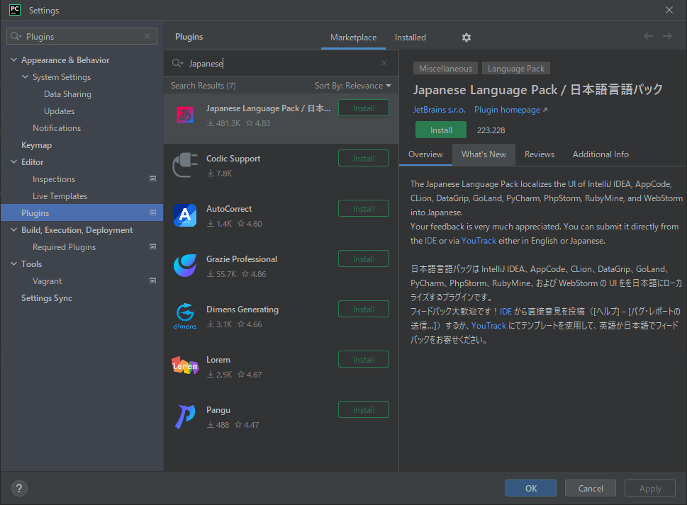 PyCharmを日本語化する 2024 11/13 開発日誌 2023年03月10日2024年11月13日 File → Settings(Ctrl + Alt + S) でSettings画面を出す 左側からPluginsを選び、真ん中から「Japanese」を検索すると出てくる、「Japanese Language Pack」をインストールすればOK 開発日誌 この記事が良かったらシェアお願いします! URLをコピーしました! URLをコピーしました! ZOTAC PI225をセットアップした(Ubuntuで) Red Hat Developer Subscriptionの有効化手順 コメント コメントする コメントをキャンセルコメント ※ 名前 ※ メール ※ サイト 次回のコメントで使用するためブラウザーに自分の名前、メールアドレス、サイトを保存する。